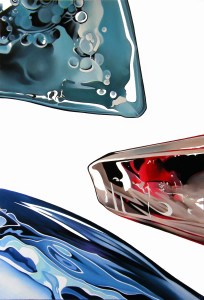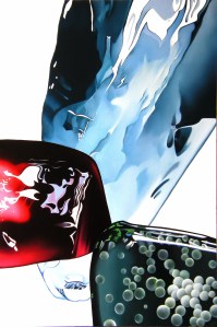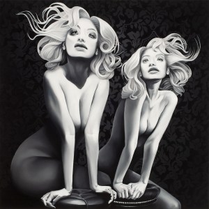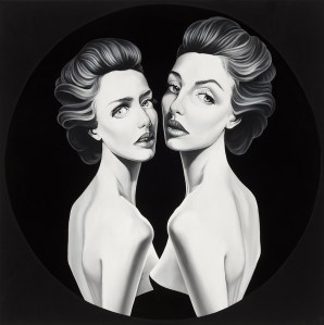 The goal is to produce a duality or imbalance between the neoclassical frozen or theatrical pose of the models and the association of the matter and the colours; mysticism is replaced by narcissistic tendencies
