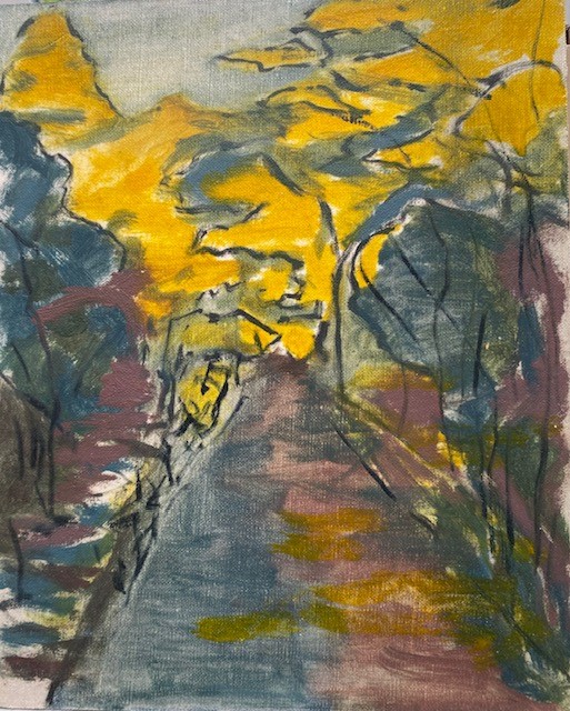 jan blemming aerial vies the path may 2024 29th May 202431st Jul 2025 | art0critic Autumn Yellow trees overlooking a path in forest. Oil